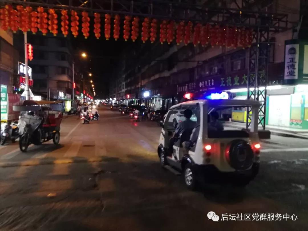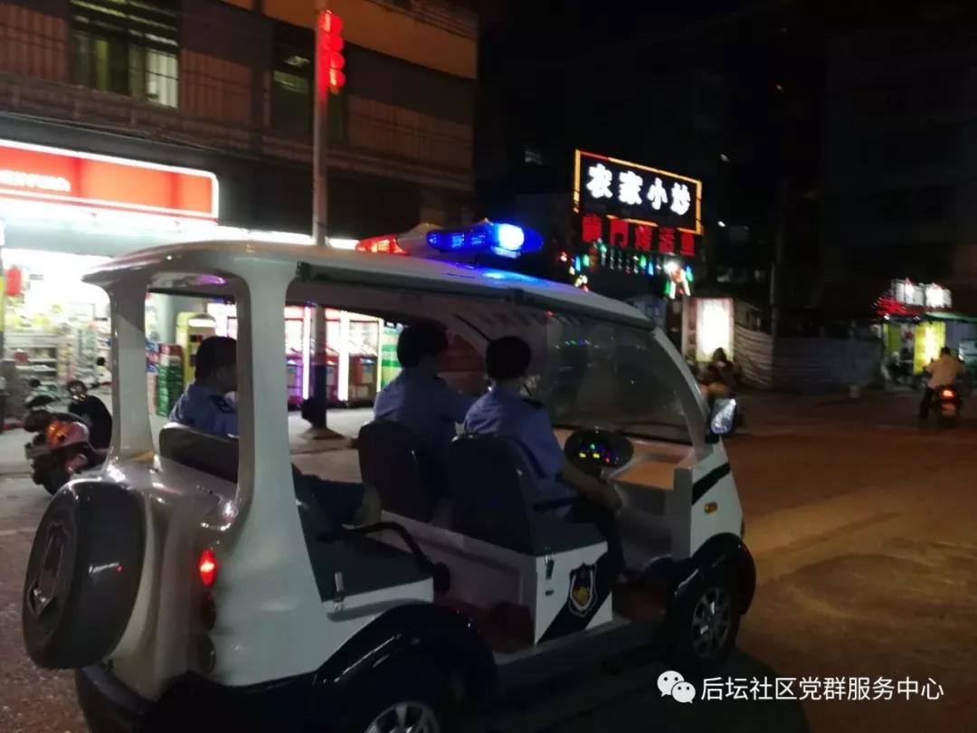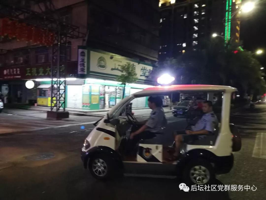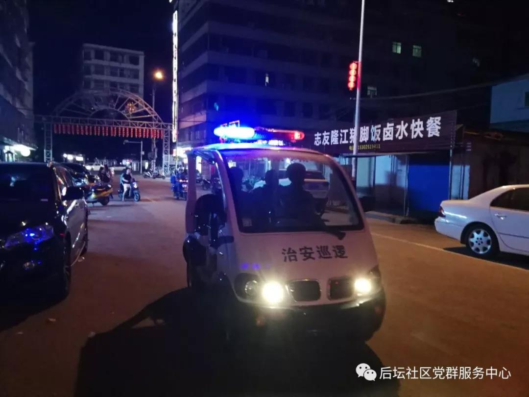 为切实做好辖区的安全稳定工作,确保社区居民的生活安全稳定和谐。近期来,后坛社区保安队充分启用治安巡逻队的作用,在辖区主干道、居民楼房、沿街商铺、大街小巷等地进行巡逻、检查、排除安全隐患。