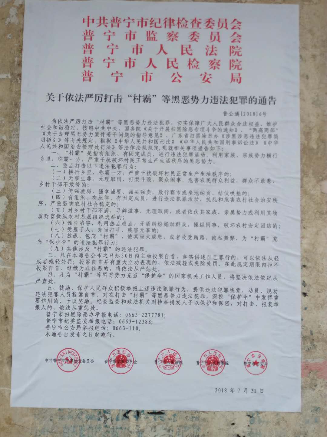 关于依法严厉打击‘’村霸”等黑恶势力违法犯罪的通告