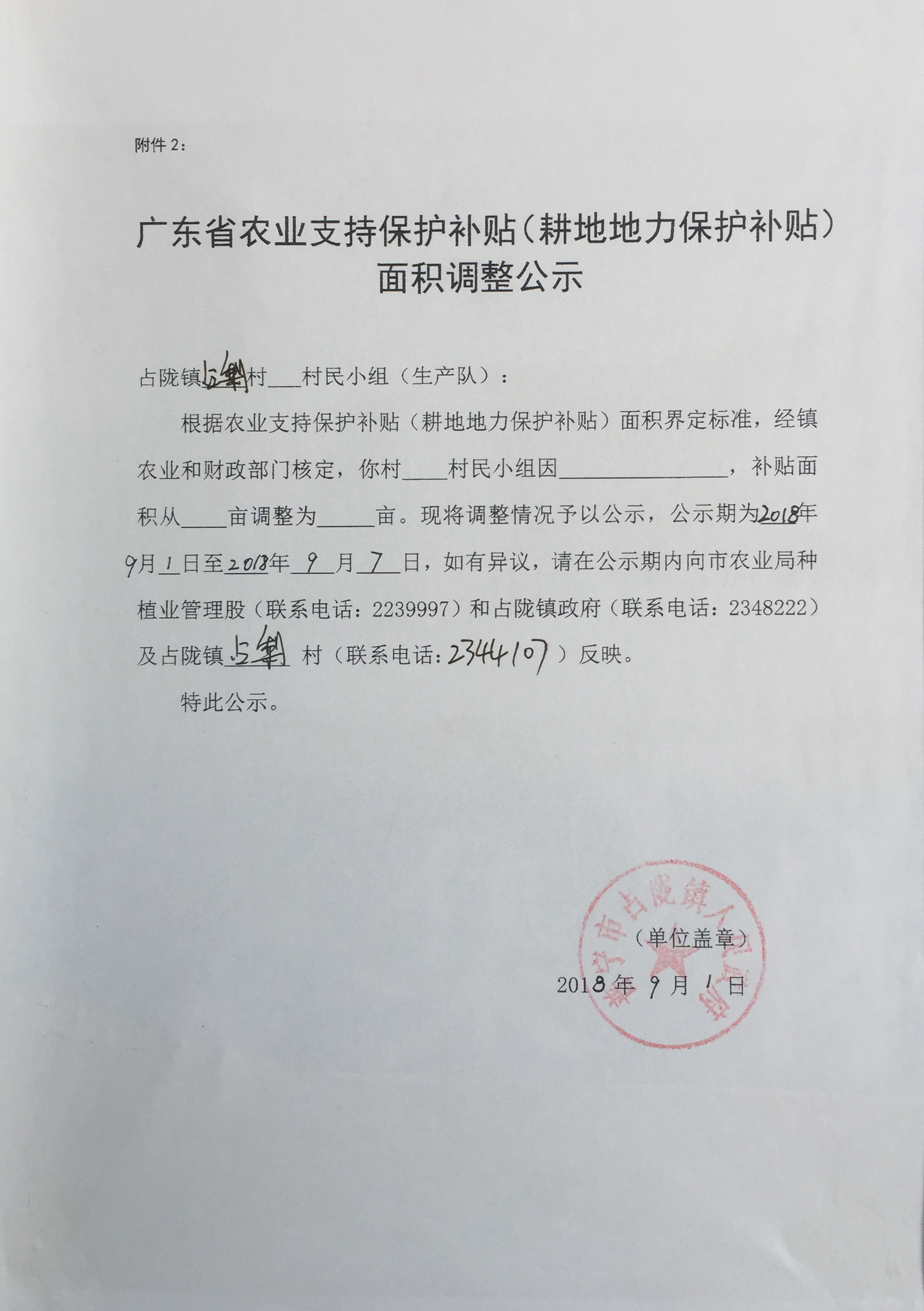 广东省农业支持保护补贴(耕地地力保护补贴)面积调整公示