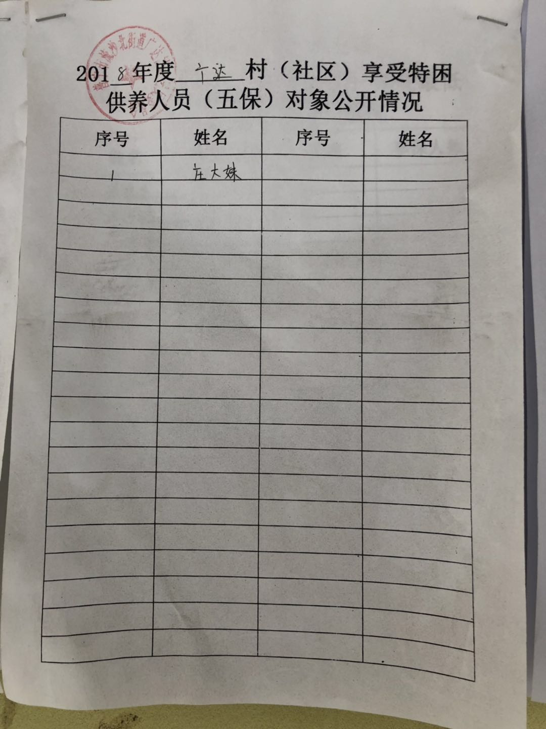 2018年度广达村享受特困供养人员(五保)对象公开情况