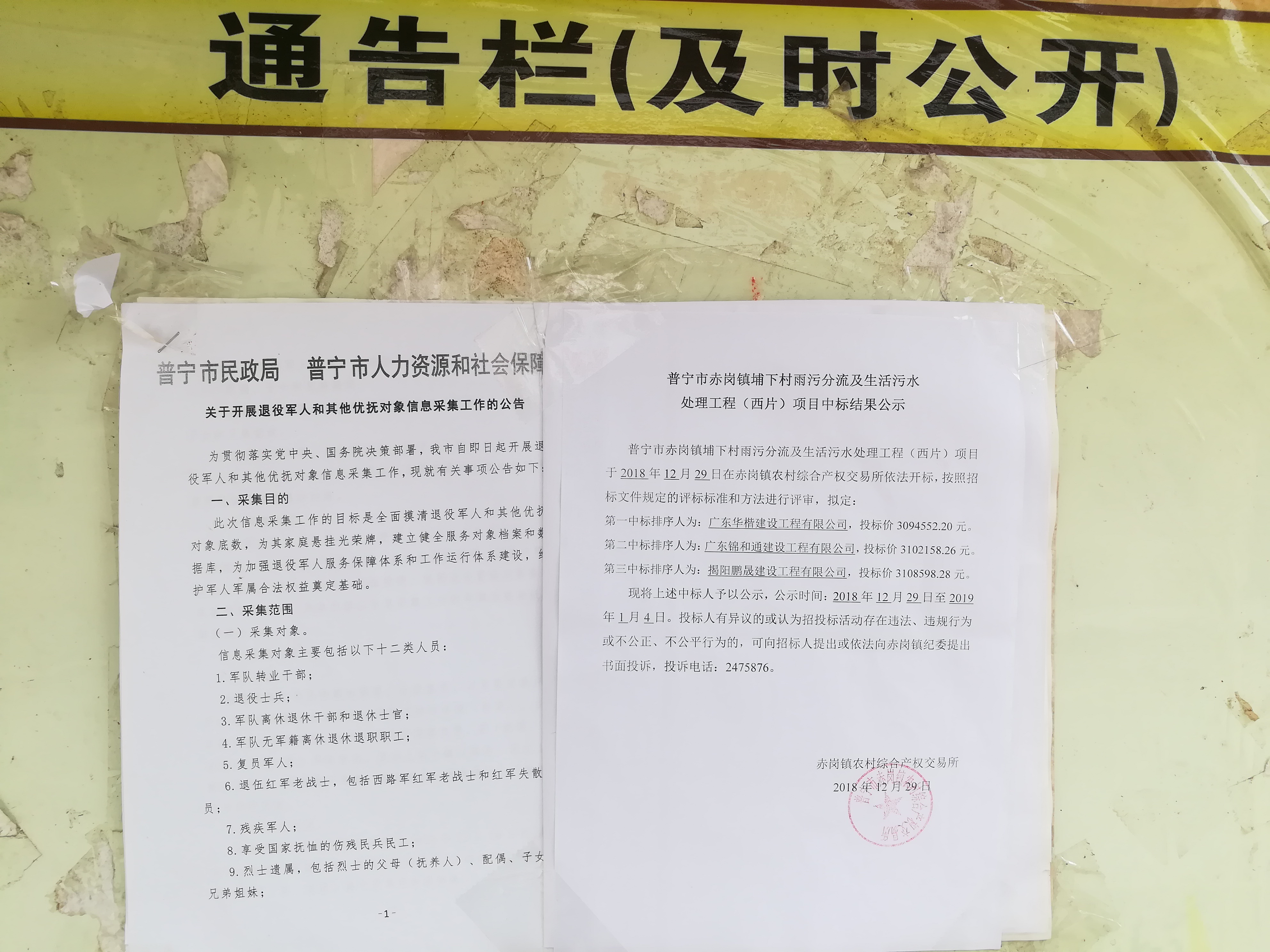 普宁市赤岗镇埔下村雨污分流及生活污水处理工程(西片)项目招标结果公示