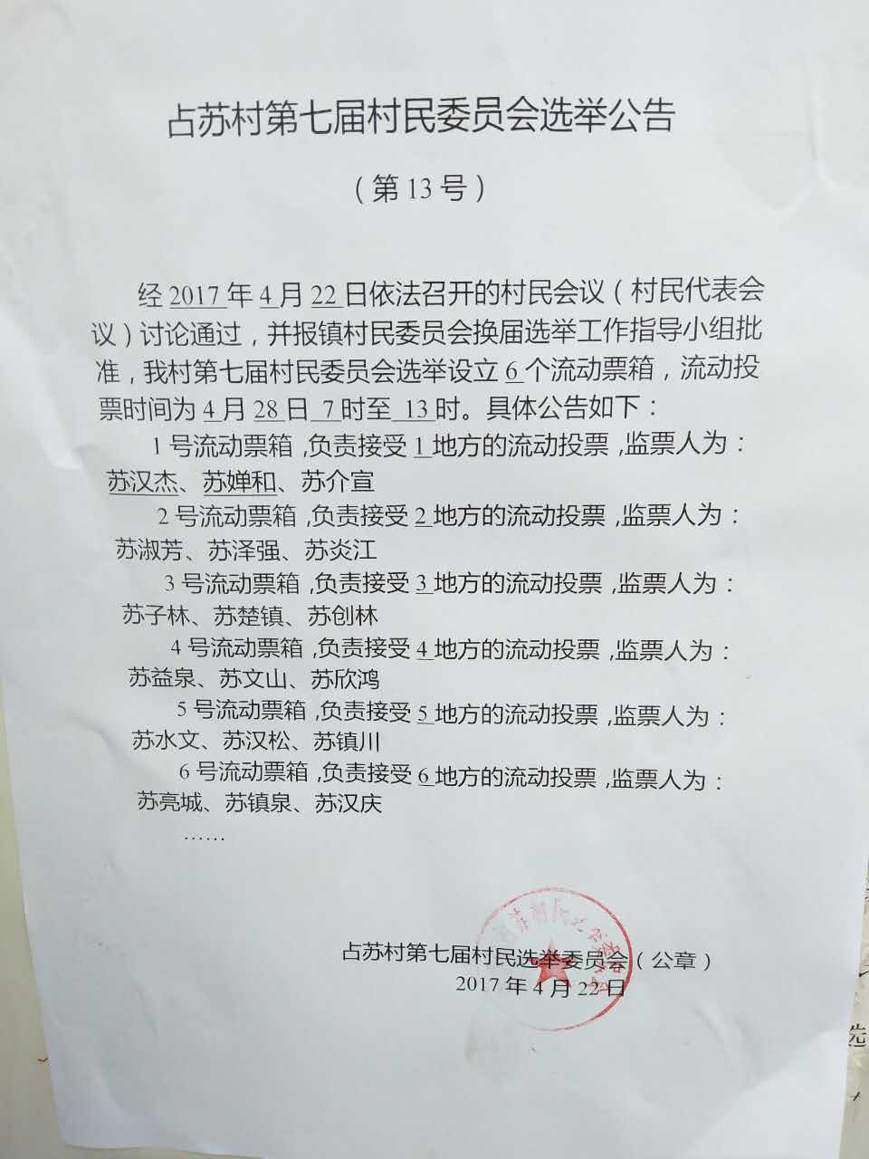 占苏村第七届村民委员会选举公告(13号))