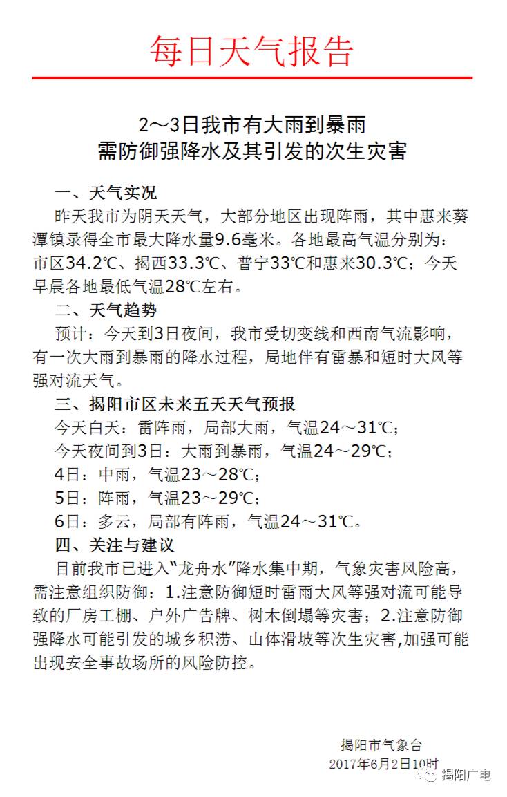 据市气象台预报,受西南季风和切变线共同影响,预计,未来四天我市天气不稳定,降水频繁,其中2-3日全市有一次大雨到暴雨,局部大暴雨的降水过程,并伴有雷暴和短时大风等强对流天气。市三防指挥部昨天发出《关于切实做好近日强降雨和强对流天气防御工作的通知》。