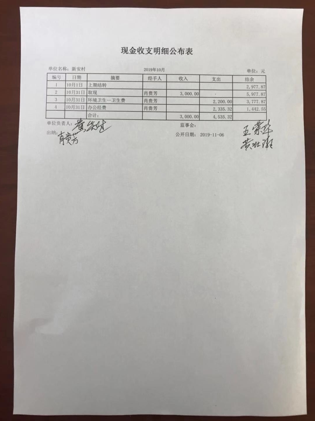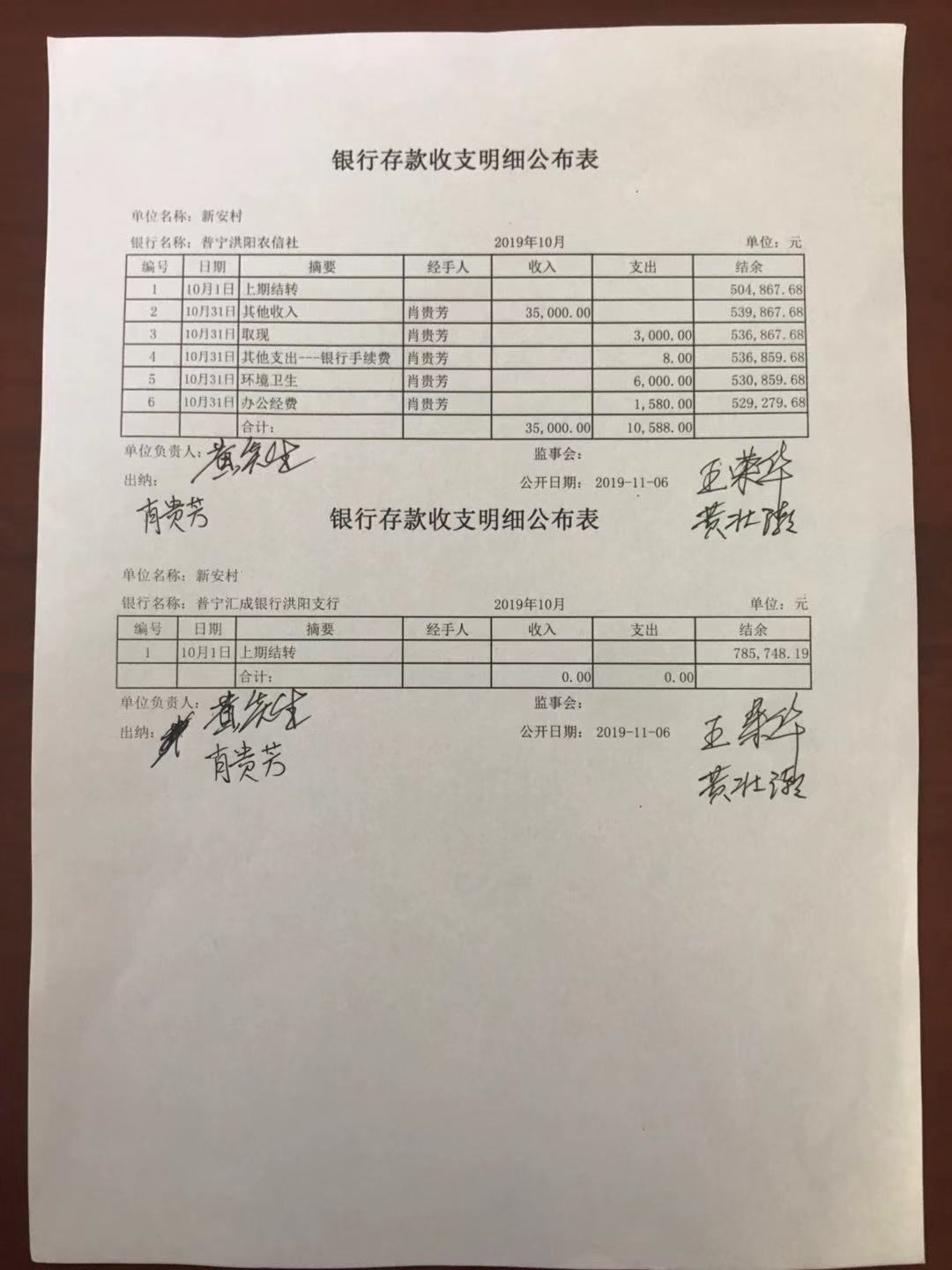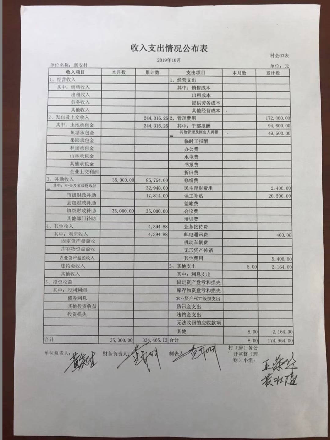 报表单位: 新安村 2019年10月 单位:元