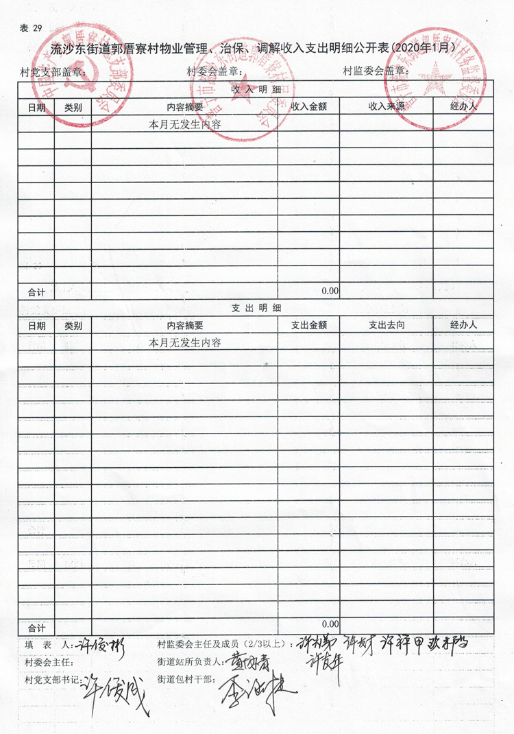流沙东街道郭厝寮村物业管理、治保、调解收入支出明细公开表(2020年1月)