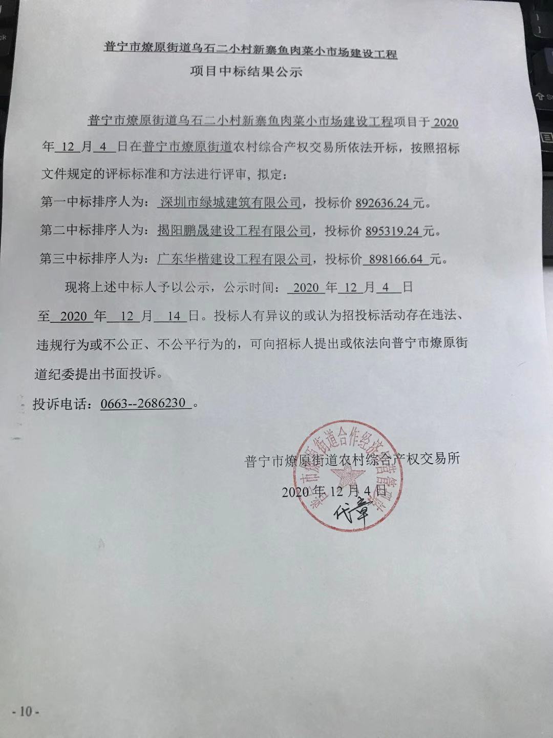乌石村二小村新寨鱼肉菜小市场建设工程中标结果