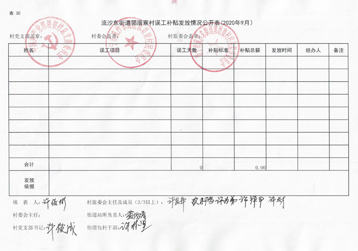 流沙东街道郭厝寮村误工补贴发放情况公开表(2020年9月)