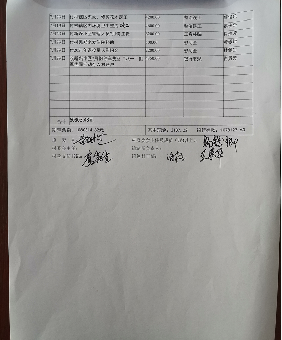 洪阳镇新安村财务收支及现金和银行存款余额公开表(2021年7月)