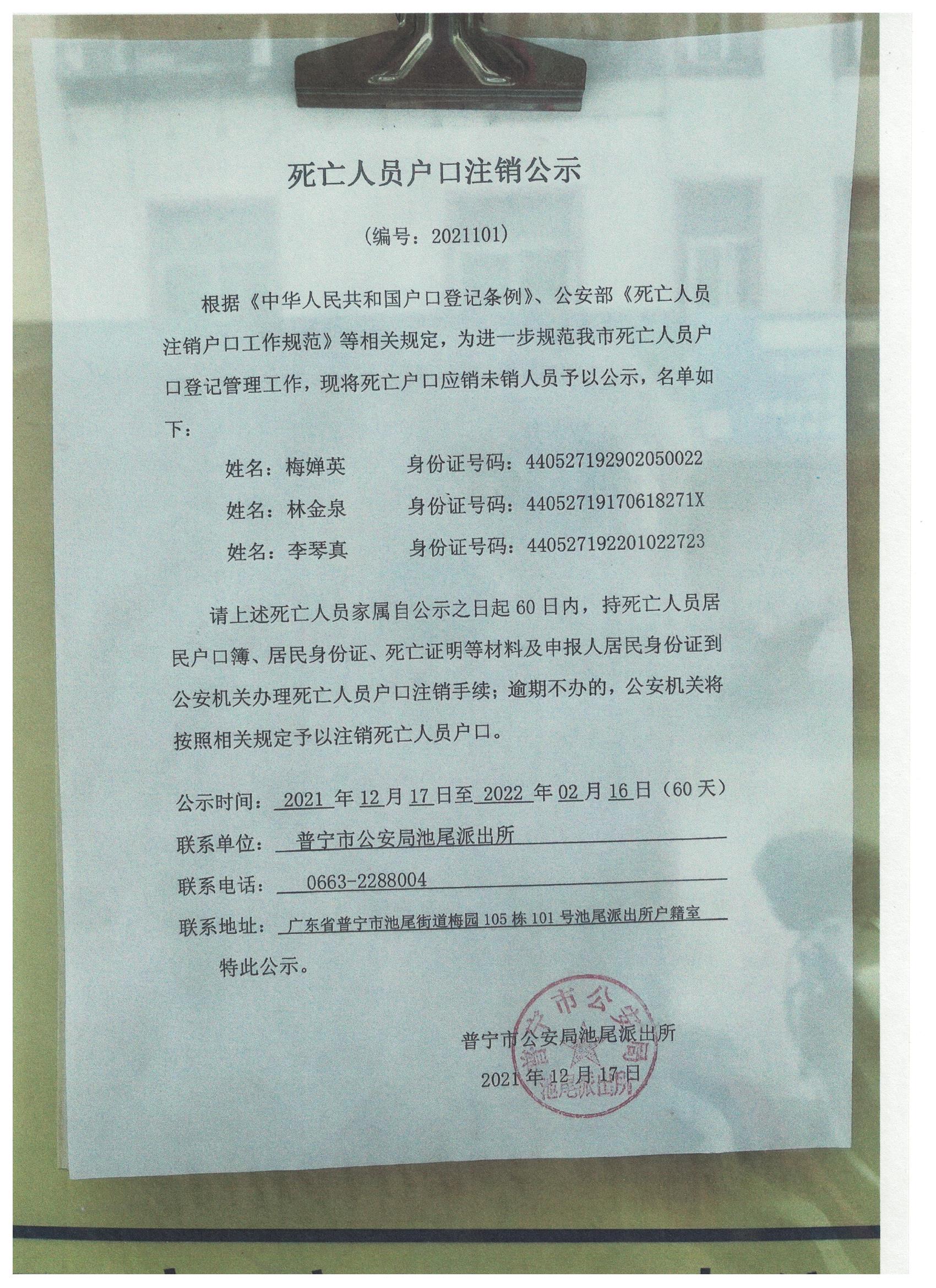 死亡人员户口注销公示(编号:2021101)