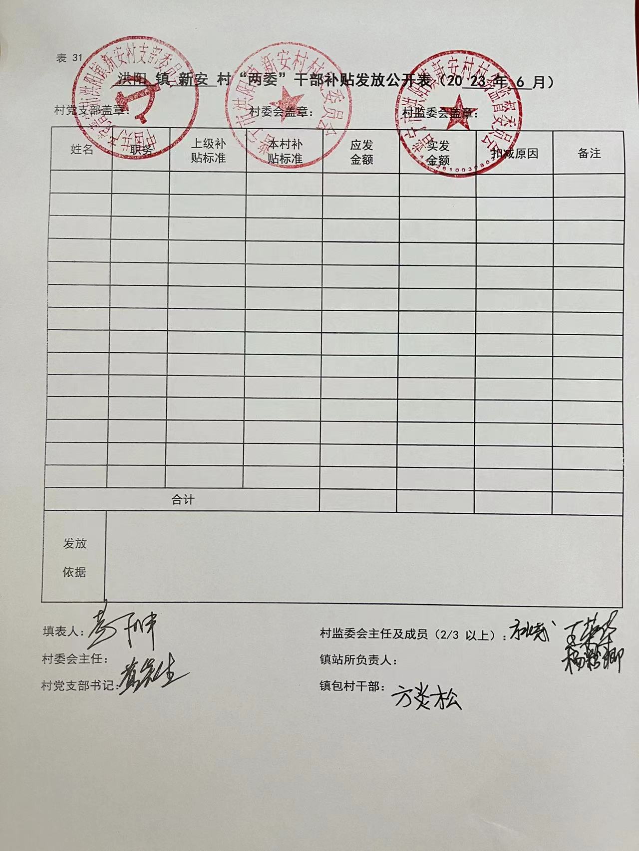 洪阳镇新安村“两委”干部补贴发放公开表(2023年6月)