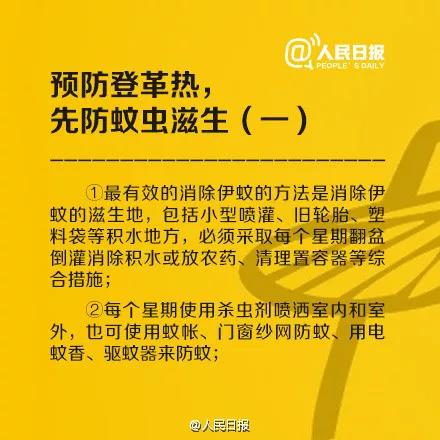 (1)登革热疫区人群要做好个人防护,尽量穿长袖衣裤,减少暴露,避免蚊虫叮咬;